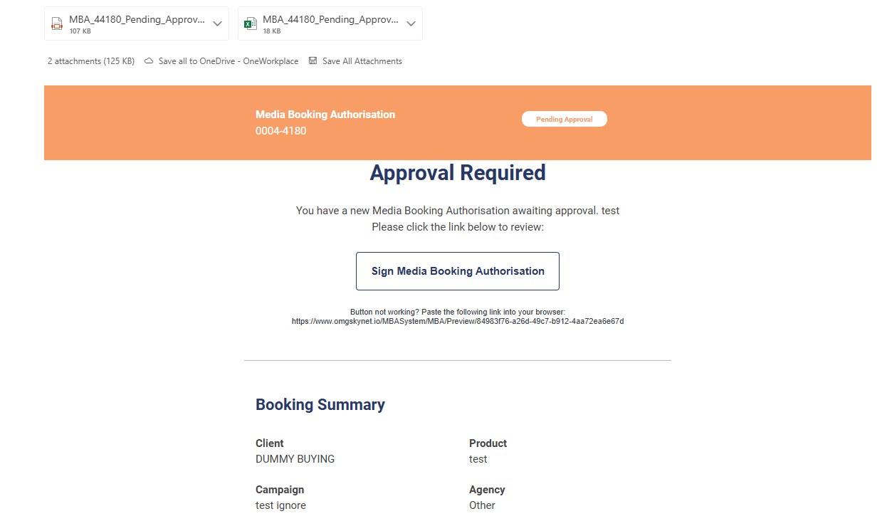 - Click Sign Media Booking Authorisation. Click button to open MBA in browser. URL is provided in email body for copy & pasting into browser directly.