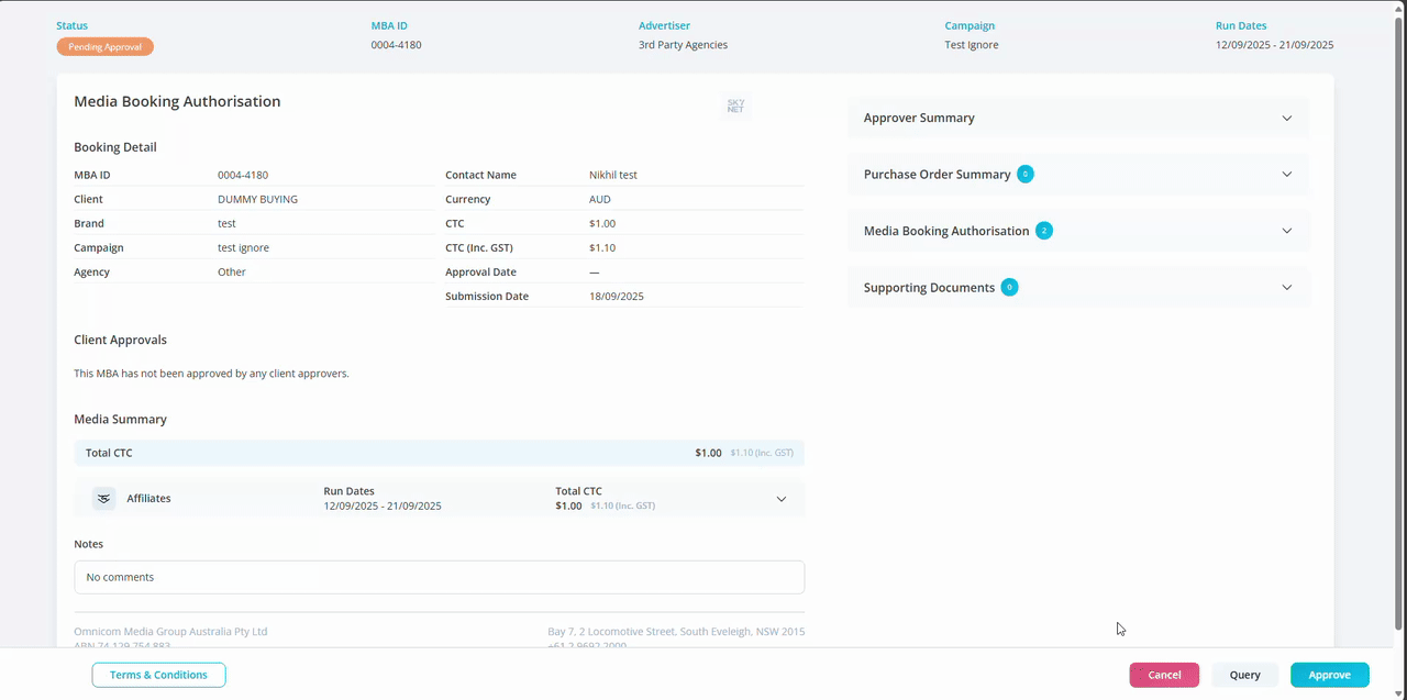 Approver actions are controlled from the buttons on the footer. Available actions: Print, T&Cs, Cancel, Query & Approve.