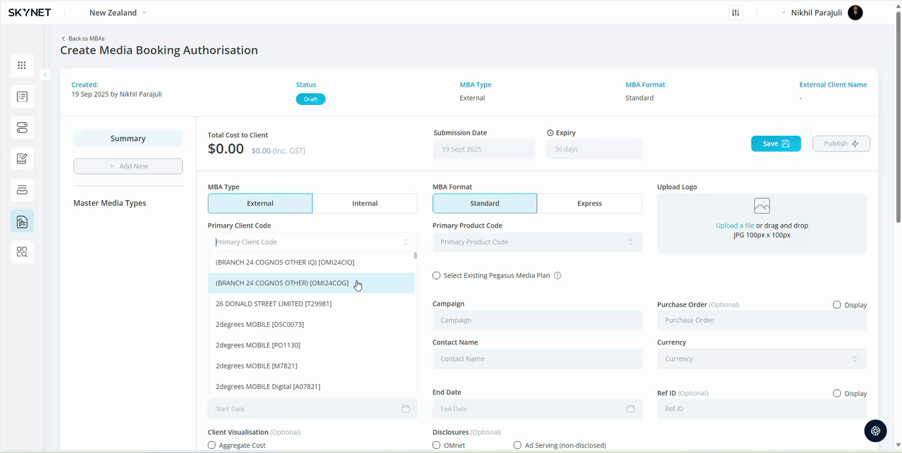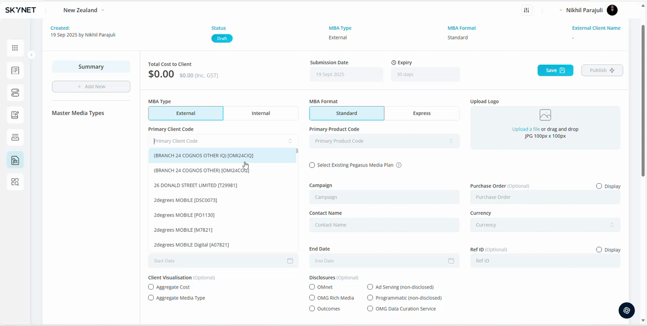 The create function for MBAs in Skynet for New Zealand supports two additional features to allow "Creation of New Pegasus Media Plan Codes" and/or the ability to "Assign Existing Pegasus Media Plans". The following article gives you an understanding on how we made this work using Pegasus Database & API integration to the existing Create MBA workflow.