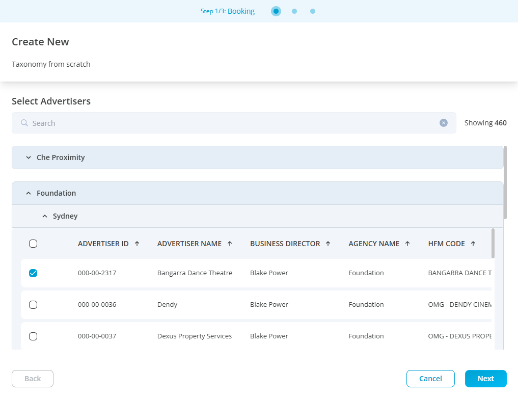 Select the advertiser for whom you’re creating the taxonomy. To use a template, ensure the advertiser's name matches the one used when the template was created.