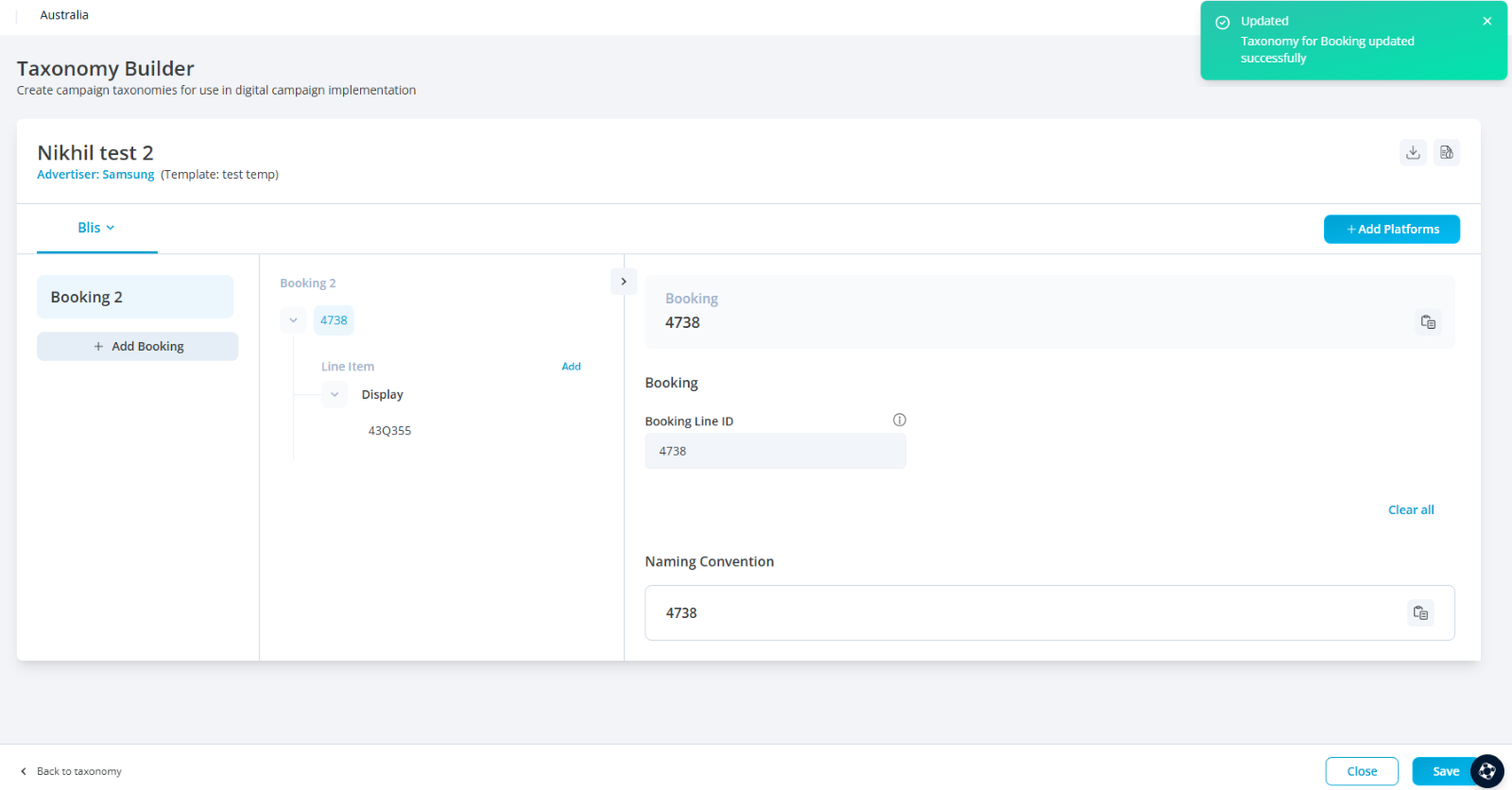 Once the user has created a campaign, added insertion order and line item in the taxonomy then user will be able to save the taxonomy, A confirmation message “Taxonomy for <Campaign name> updated successfully”, this created taxonomy will be saved on taxonomy listing page.
