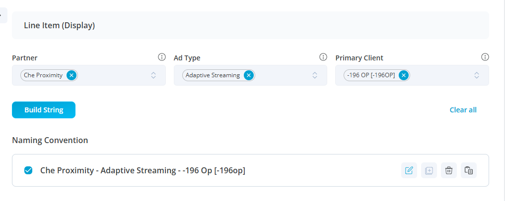 Once the string is built, it will appear under the "Naming Convention" section, with a checkbox next to it. This allows users to select and make changes such as edit, duplicate, delete, or copy.