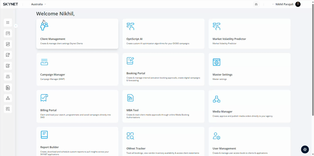 On logging in to the platform, you will be directed to the homepage. This acts as the central navigation system of SKYNET. Application cards are found on the homepage and offer a one-click access point to the applications enabled to a user, including MBA Tool & Booking Portal.